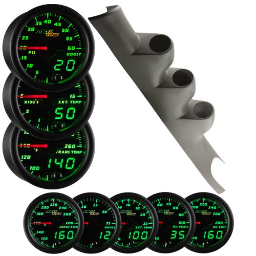 MaxTow 03-08 Taupe Dodge Ram Diesel Gauge Package Black Face Boost, EGT & Trans Temp MaxTow's 03-08 Dodge Ram diesel gauge package allows you to easily monitor your trucks vital functions while keeping your dashboard free from obstructions, and integrates perfectly with diesel powered vehicles. Vehicle Specific Gauge Pod The included taupe triple pillar pod is specifically designed and color matched to the 03-08 Dodge Ram. This pod holds three 52mm (2 1/16th inch) gauges, is crafted from the high quality ABS plastic allowing it to withstand cracking, fading, and warping, and is easily installed to your existing A-pillar giving your Ram a custom fit and finish. Gauges Included This MaxTow gauge package features a 60 PSI boost gauge with 6 feet of boost hose and brass compression fittings, a 1500 EGT gauge that includes an exhaust temperature probe with 6 feet of steel braided cable, as well as a transmission temperature gauge with temperature sender all in our Double Vision® gauge series. These 52mm (2 1/16th inch) gauges will give you the classic look of an analog gauge while also giving you an easy to read green digital numerical readout. This gauge series also gives you multiple dimming options allowing you to your set your preferences when hitting the road during the day or the late hours of the night, and the included brightness recall function will remember the brightness setting you had on before powering your vehicle down so you won't have to reset it every time you turn your vehicle on. Ease of Install This MaxTow gauge package comes complete with all hardware, sending units, probes, adapters, and fittings required to install your new gauges and pillar pod. All gauges include a 3 foot power wire and a 9 foot sensor wire, assuring that you will have more than enough wire for your installation. Lifetime Support MaxTow includes a one year limited warranty and lifetime technical support with every custom gauge package that is purchased.